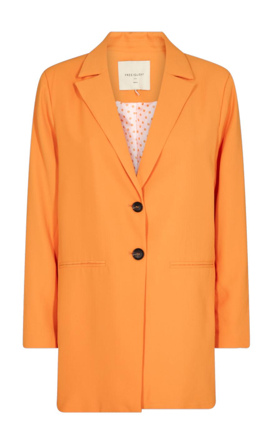 Vi har fundet Freequent Blazer Lenny Flame Orange fra Freequent hos fashionbystrand i kategorien . Blazer fra Freequent Flot blazer fra Freequent i orange, med cool prikket for. Blazeren har knaplukning foran, revers samt to front lommer. Desuden har jakken en lille slids bagpå. Kan bruges til alle slags lejligheder, og vil uden tvivl pifte dit outfit