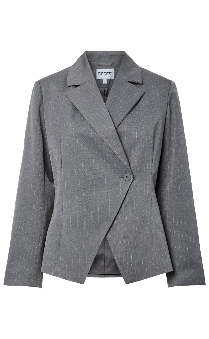 Vi har fundet Pieces Blazer Falka Grey Pinstripe fra Pieces hos fashionbystrand i kategorien . Blazer fra Pieces Flot blazer fra Pieces i et grå stribet nåleprint. Blazeren har en asymmetrisk knaplukning samt lange ærmer.